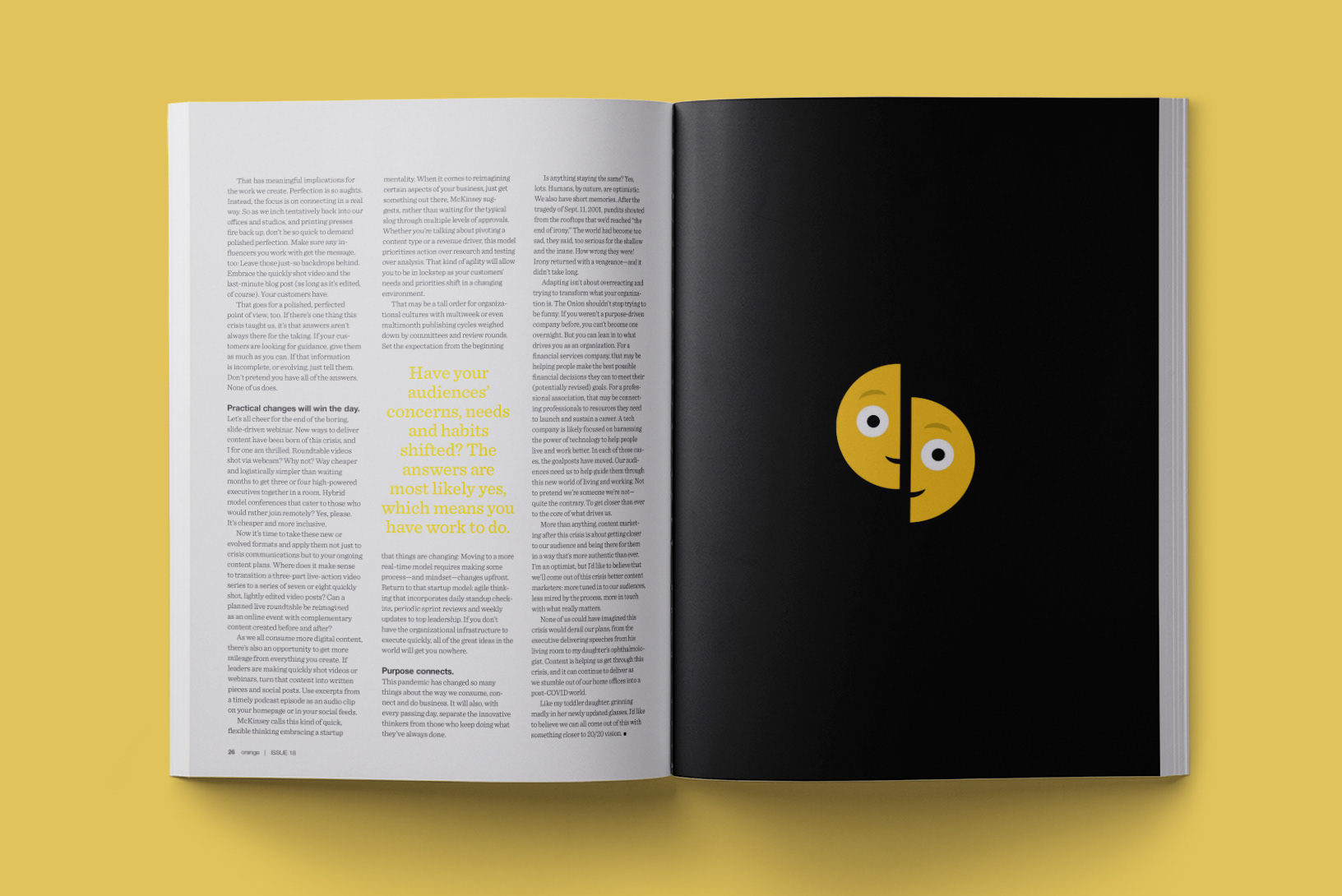 I worked with Doug Kelly to come up with this concept, and then created these four custom emoji illustrations for this magazine feature. The illustrations were printed in the Summer 2020 Issue of Orange Magazine.