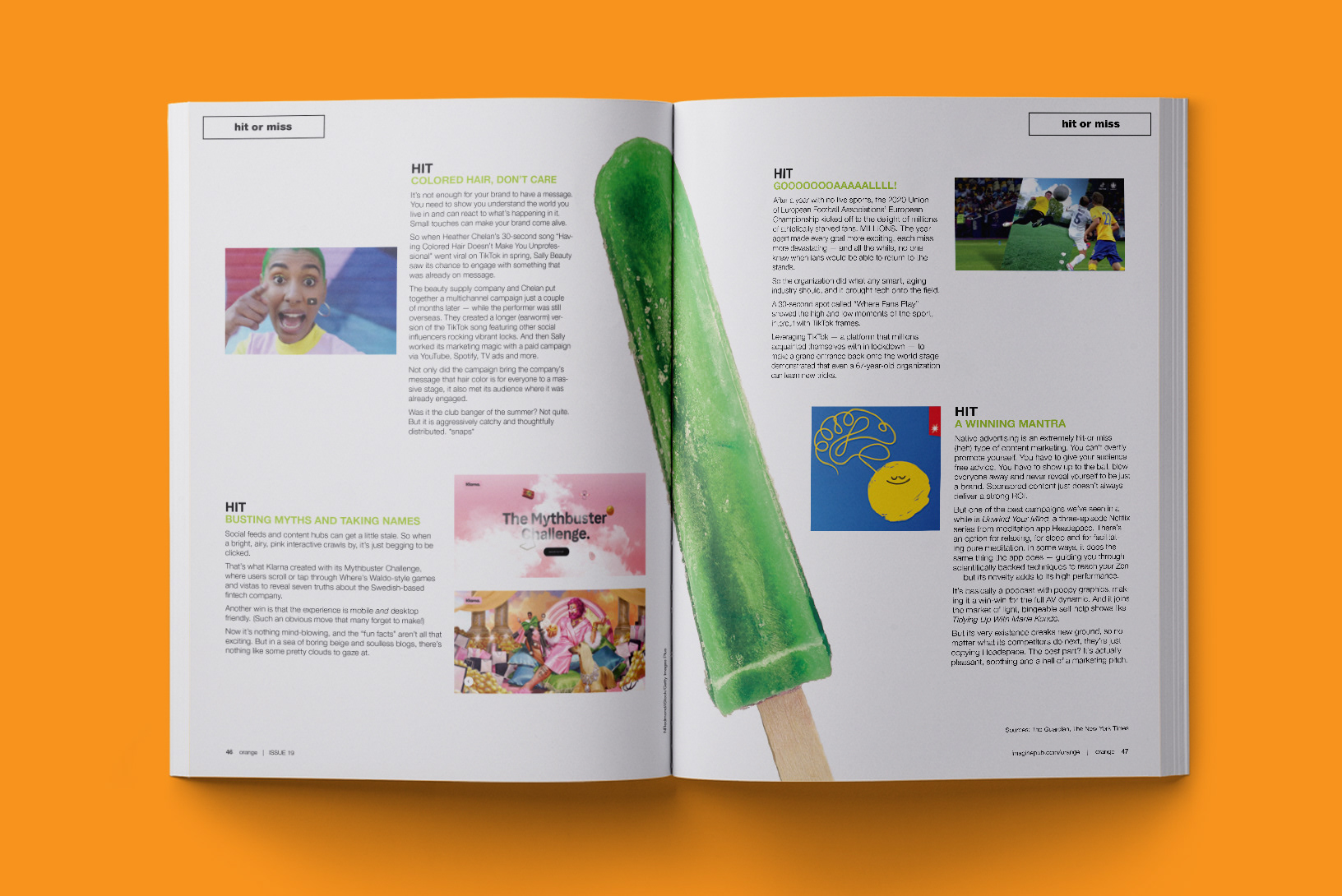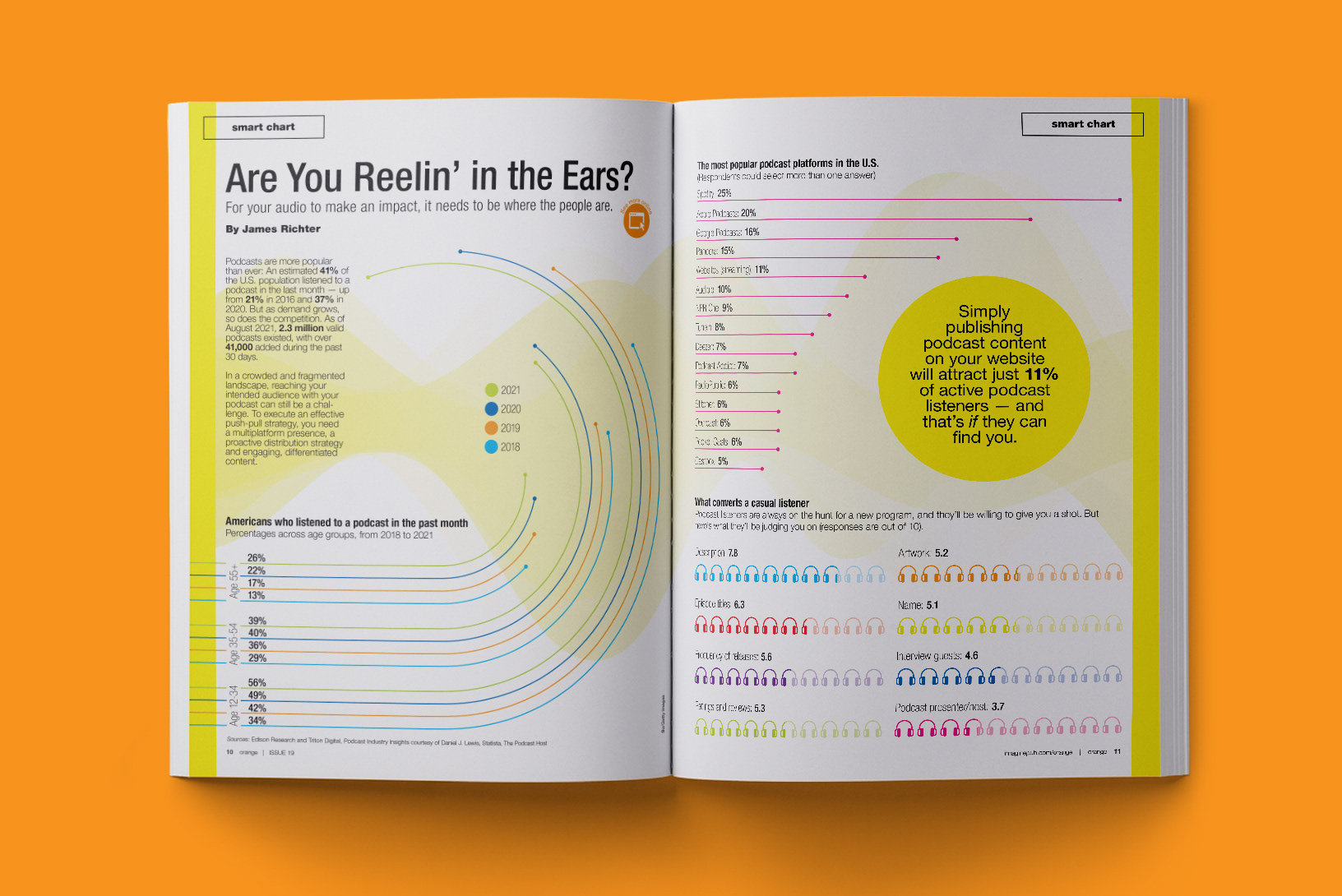 Orange magazine, developed by Imagination Publishing, focuses on the ins and outs of content marketing. The following are a few of the department spreads that I designed.